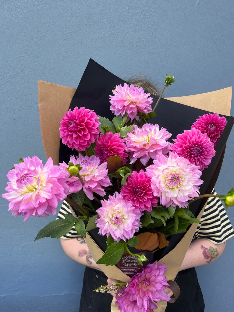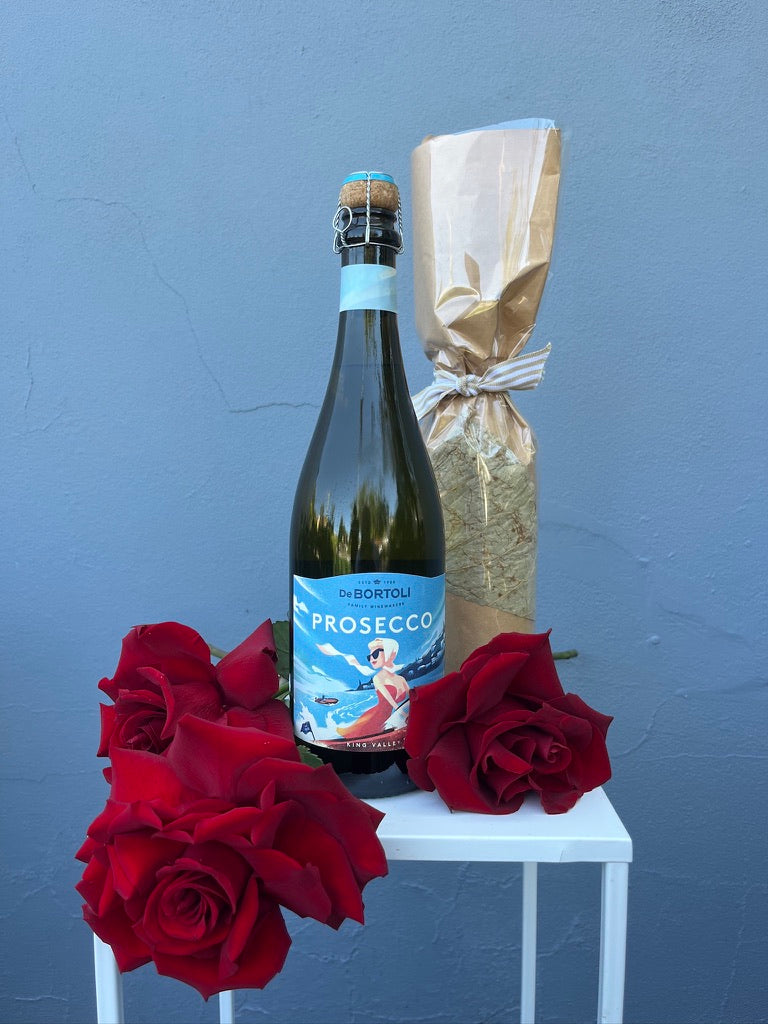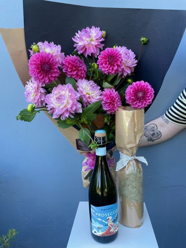 A Bouquet of seasonal Dahlias with De Bortoli King Valley Prosecco ,perfect for weekend mischief